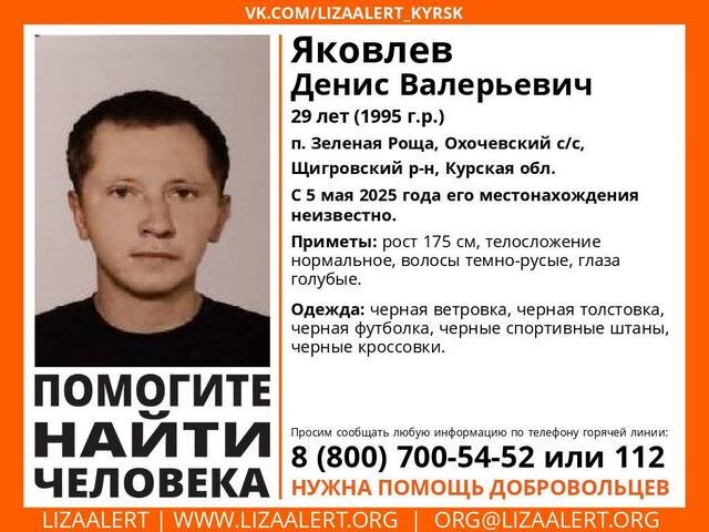 Поисковый отряд «Лиза Алерт Курск» распространил ориентировку на розыск пропавшего без вести жителя поселка Зеленая Роща Охочевского сельсовета Щигровского района Курской области. По данным волонтеров, пропал Яковлев Денис Валерьевич в возрасте 29 лет. Его местонахождение неизвестно с 5 мая. Требуется помощь добровольцев в поисках исчезнувшего парня. Приметы: рост — 175 см, нормального телосложения, волосы темно-русые, глаза голубые. Одежда: черные ветровка, толстовка и футболка, черные спортивные штаны, черные кроссовки. Сергей Яшин, по материалам https://vk.com/lizaalert_kyrsk Постоянный адрес новости на сайте «Друг для друга» ~ https://dddkursk.ru/lenta/2025/05/12/118760/. Новости Курска за ~ 12 мая ~ май 2025 года.