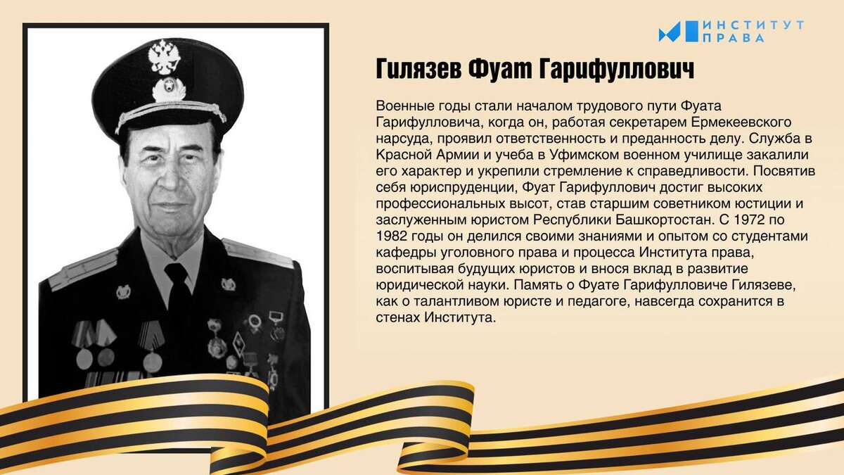 В рамках акции "Судьба солдата" Институт права вспоминает Фуата Гарифулловича Гилязева - ветерана, прошедшего службу в Красной Армии и Уфимское военное училище! Его трудовой путь начался в военные годы с работы секретарем Ермекеевского нарсуда, где он проявил ответственность и преданность делу. Посвятив себя юриспруденции, Фуат Гарифуллович стал старшим советником юстиции и заслуженным юристом Республики Башкортостан! 🔹С 1972 по 1982 годы он делился своими знаниями и опытом со студентами кафедры уголовного права и процесса Института права, воспитывая будущих юристов и внося вклад в развитие юридической науки. Память о Фуате Гарифулловиче Гилязеве, как о талантливом юристе и педагоге, навсегда сохранится в стенах Института! 🕊️