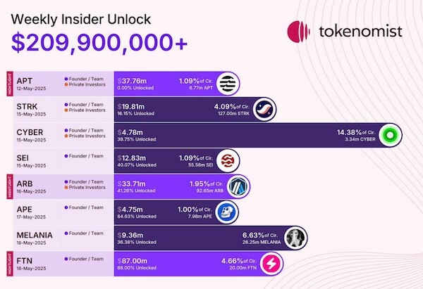 🔓 Крупные разлоки токенов на неделе 12–18 мая 2025 года Криптовалютный рынок готовится к значительным разлокам токенов в период с 12 по 18 мая 2025 года, которые могут существенно повлиять на цены и общую рыночную динамику. По данным Tokenomist, общая сумма разлоков превысит $209,9 млн, включая токены FTN, APT, ARB, STRK, SEI, MELANIA, CYBER и APE. Эти события связаны с высвобождением токенов, ранее зарезервированных для основателей, команд и частных инвесторов, что может увеличить предложение на рынке и вызвать волатильность. Топ-анлоков токенов на 12-18 мая: 🔘 $FTN (4.66%) — $87 млн 🔘 $APT (1.09%) — $37.76 млн 🔘 $ARB (1.95%) — $33.71 млн 🔘 $STRK (4.09%) — $19.81 млн 🔘 $SEI (1.09%) — $12.83 млн 🔘 $MELANIA (6.63%) — $9.36 млн https://cryptoage.com/ru/4831-крупные-разлоки-токенов-на-неделе-12–18-мая-2025-года.html