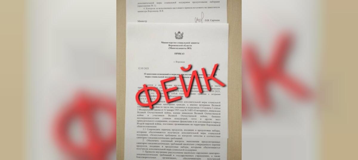 Фальшивый документ появился в интернете В интернете появился фальшивый документ, который утверждает, будто воронежским ветеранам Великой Отечественной войны к празднику 9 Мая выдали просроченные продукты в качестве подарка. Документ также прислали в редакцию «МОЁ!». Также утверждалось, что из-за испорченных продуктов ветераны получили острое отравление. В правительстве Воронежской области рассказали, что информация является фейком. Власти отметили, что министерство социальной защиты региона не издавало подобных документов. Ранее фейк об отравленной еде и воде у волонтёров на праздновании 80-летия Победы разоблачили в Воронеже.