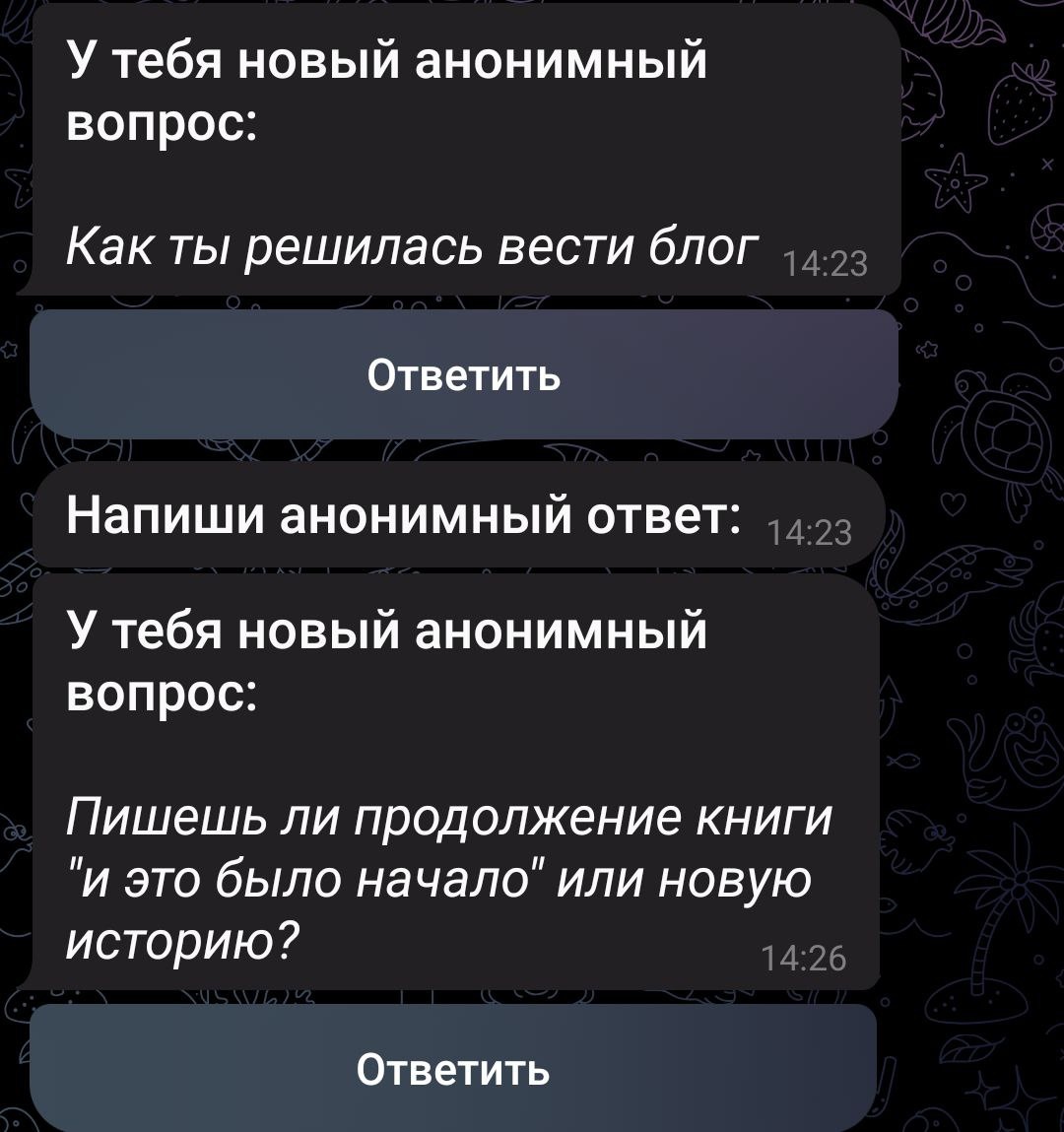🙁 Довольно просто, я вела запретграм пять лет назад, и все что знала и над чем работра решила осуществить в тг. Мне здесь по душе собирать классных и творческих людей и их истории🤍 ☹️ Продолжение не пишу. Решила что эта история останется пока с открытым финалом. Возможно в будущем вернусь, но врятли. Сейчас работаю над новой историей🫶