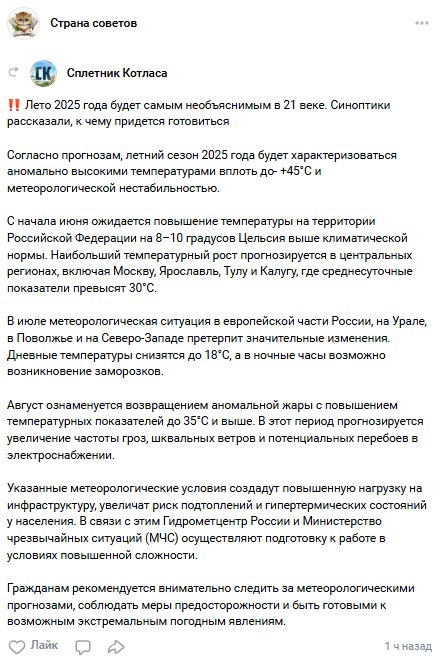 В соцсетях ходят слухи, что лето 2025 года будет самым «необъяснимым» за весь XXI век и запомнится россиянам контрастами и температурными качелями. Якобы в июне и августе столбик термометра приблизится к отметке в +45°C, а июле — к минусовым значениям. Август к тому же принесет грозы, шквальные ветры и прочие экстремальные условия, пугают россиян в Сети, ссылаясь при этом на Гидрометцентр. Но страхи россиян развеял научный руководитель Гидрометцентра России Роман Вильфанд. По его словам, информации об аномальной летней температуре в 2025 году от ведомства не исходило. «Какие-то фейки… От Гидрометцентра эта информация не исходит», — констатировал Вильфанд. Синоптик объяснил, что слухи появились на фоне искажения информации. Речь шла о средней глобальной температуре, а не о температуре в европейской или в азиатской частях России. Эксперт уточнил, что средняя глобальная температура увеличилась, и это связано с повышением температуры Мирового океана. Но, по прогнозам синоптиков, летом 2025