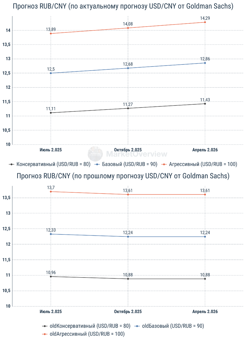 Goldman Sachs обновил прогноз по курсу юаня к доллару: The undervalued levels of the currency, both on a real trade-weighted basis but especially versus the dollar, all point to the possibility for a stronger onshore yuan as a potential offset to tariff reductions - Goldman Sachs analysts led by Kamakshya Trivedi Недооценённый курс юаня, особенно по отношению к доллару, создаёт потенциал для его укрепления. Это может компенсировать эффект от снижения пошлин - считают аналитики Goldman Sachs под руководством Камакшьи Триведи. В прогнозе банка говорится, что курс USD/CNY в течение 12 месяцев может достичь 7.00, при промежуточных оценках 7.20 (через 3 месяца) и 7.10 (через 6 месяцев). Такой разворот говорит о повышенной уверенности в экономике Китая и стабилизации курса (и сегодняшние новости о том, что по трехзначным торговым пошлинам договорились добавляет позитива). Но что это значит для пары рубль/юань (RUB/CNY)? Попробуем рассчитать аналог кросс-курса по самой простой формуле RUB/CNY