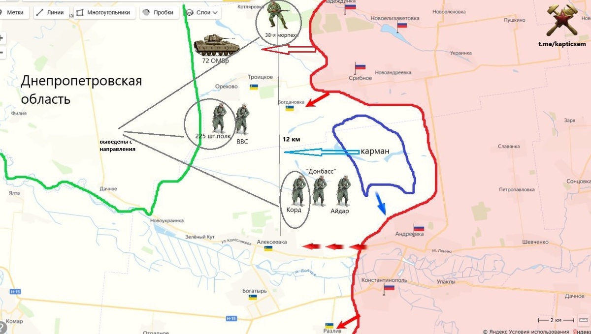 Бои вблизи административной границы Донецкой и Днепропетровской областей МО РФ:Решительными действиями подразделений группировки войск «Центр» освобожден населенный пункт Котляровка Донецкой Народной Республики. Схема от 29 марта. На ней тогда нанес переброшенные на это направление резервы ВСУ, это помимо нескольких бригад и отдельных батальонов на этом участке фронта. Тогда в марте, украинскому Генштабу удалось затормозить наше продвижение. И где то месяц шли позиционные бои. Далее, враг убрал 225 штурмбат на Сумское направление, ну раз затишье, а затем возник оперативный кризис восточнее Покровска на участке Малиновка-Новооленовка и туда оправляются подразделения бригады "Корд" и 38-е морпехи. ВС РФ тут же усиливают нажим нашего атакующего трезубца. 24 апреля освобождена Богдановка 8 мая - Троицкое 12 мая, сегодня - Котляровка Сейчас бои идут уже, по неофициальным данным, в центре поселка Орехово. Очередная интрига. То что в ближайшие дни, а может часы наши выйдут на административну