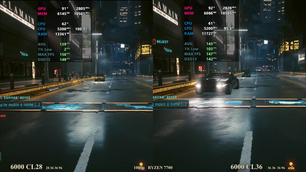 На YouTube-канале Odin Hardware показали, какой средний FPS можно получить с CL28 и CL36 в Full HD.