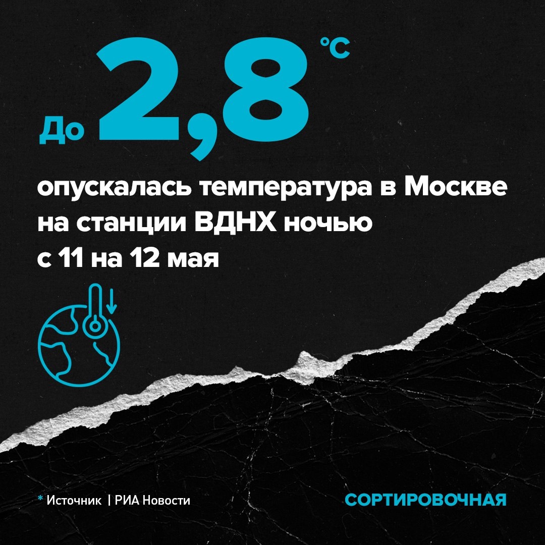 В Москве похолодало: минувшей ночью в ряде районов Подмосковья вернулись заморозки В Серпухове температура опустилась до –1,7 °C. В Москве самой холодной точкой стала ВДНХ: +2,8 °C. По словам синоптика Евгения Тишковца из «Фобоса», риск заморозков сохранится как минимум до среды. В целом неделя больше напоминает осень, чем май: дожди, местами с мокрым снегом, ночные заморозки, днём температура будет подниматься до +4-9 градусов. Это на 10–11 градусов ниже нормы для этого времени года. Подписаться на Сортировочную👍
