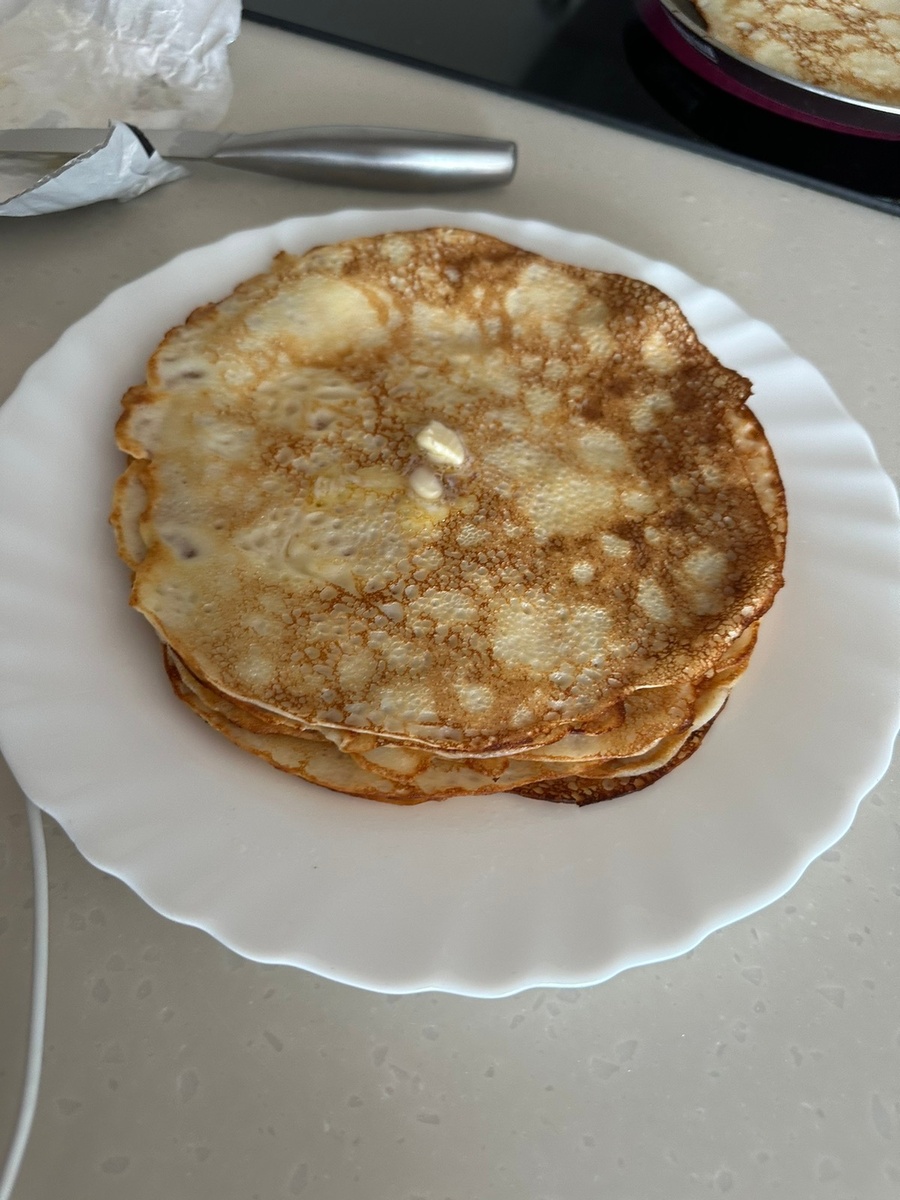 Ингредиенты: Способ приготовления : Кефир выливаем в кастрюлю и подогреваем, чтобы сахар растворился. В кефир добавляем 4 яйца и сахар (можно добавить больше сахара и тогда блинчики получатся слаще). Все перемешиваем и постепенно добавляем муку, не переставая перемешивать. В конце добавляем подсолнечное масло. Разогреваем сковороду с добавлением подсолнечного масла и начинаем выпекать блинчики с 2-х сторон. Чтобы блинчики быстро жарились нужно, чтобы сковорода была сильно нагрета. После того как блинчик приготовился выкладываем на тарелку и добавляем сливочное масло. Сумма которую вы потратите: