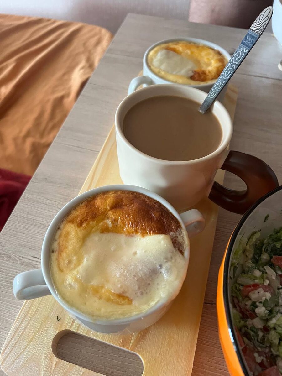 🔥 Всё перемешала, залила в кружку и запекла в аэрогриле. Получился воздушный омлет с сочной курицей и сырной корочкой.