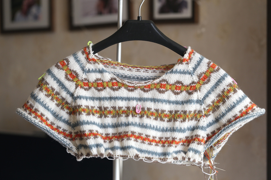 Разрезной жаккард спицами: белый жакет с узорами fair isle. 10й день