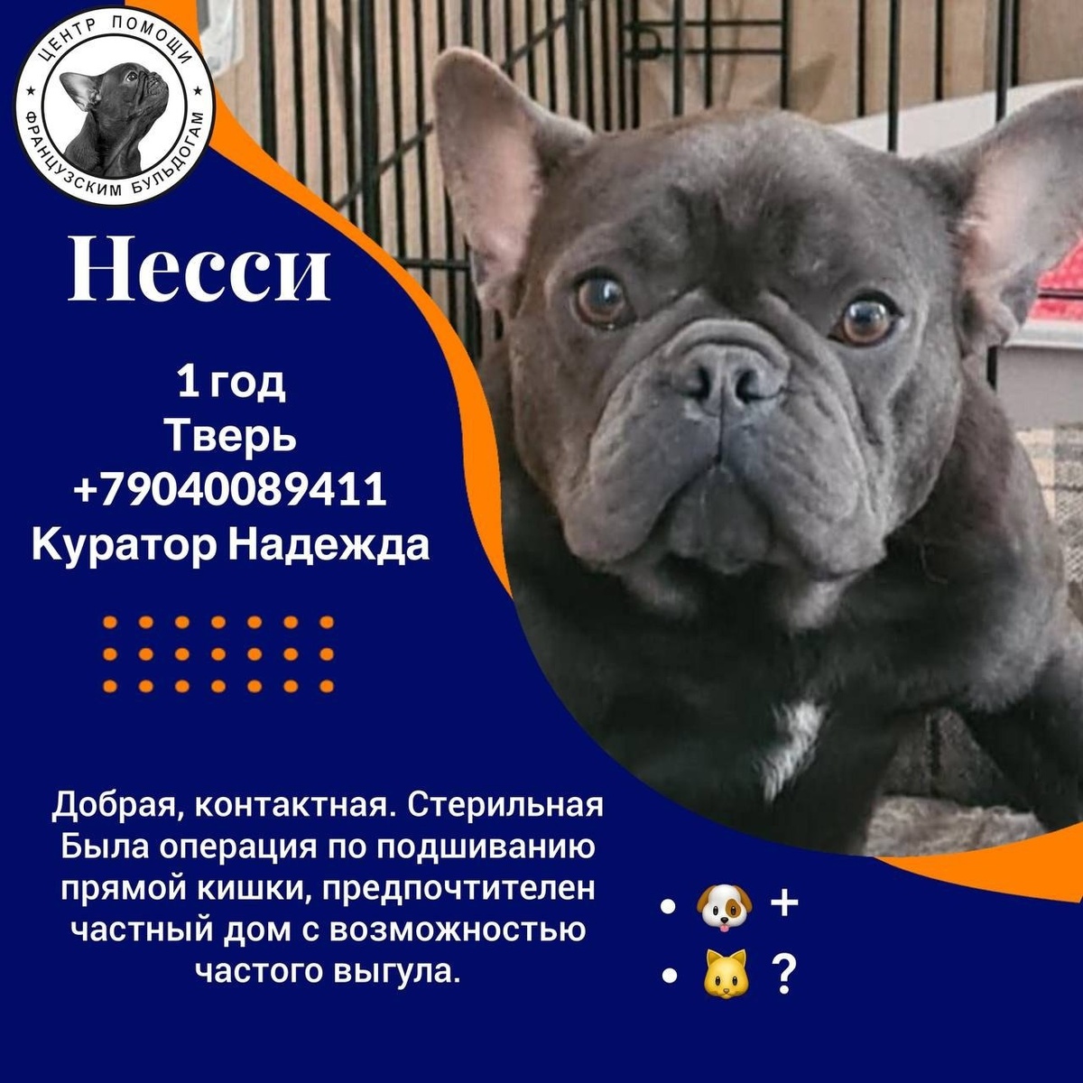Помощь в пристрое! Тверь. Несси - молоденькая ( всего 1,5 годика), красивая, с редким окрасом бульдожка. У Несси слабая мышца прямой кишки (могла не произвольно накакать), были проведены несколько операций по подшиванию кишки, сейчас есть улучшения. Стерильна. Привита. Кушает подобранный корм для чувствительного пищеварения, перевод на натуралку ИСКЛЮЧЕН! Поскольку малышка живёт в частном доме, то привыкла выходить на улицу часто, но и с пеленкой знакома. Умная, контактная, не конфликтная собака, дружит с сородичами. Территориально - Тверь. Если вы уверены в своих силах и возможностях и готовы взять ответственность за здоровье Несси - алгоритм действий простой: ✏️СНАЧАЛА заполняете анкету: https://vk.com/app5619682_-144285450 ☎️ДАЛЕЕ звоните/пишете куратору САМОСТОЯТЕЛЬНО Куратор: 89040089411 Надежда ( если Вы не дозвонились, пожалуйста , напишите мне на Вотсап, позже я обязательно отвечу). Так будет быстрее в разы!