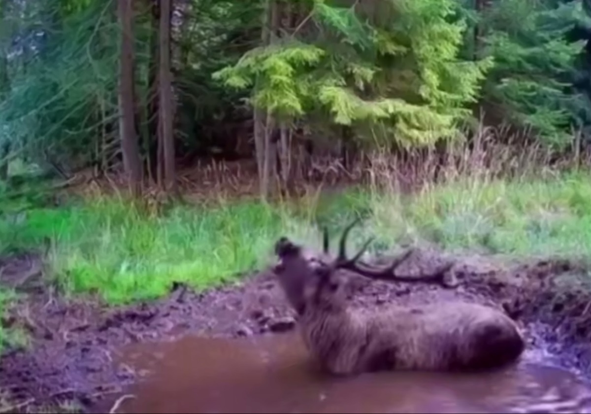 «Жену зовёт, чтобы спинку потерла» — На фотоловушку в белорусском лесу попался поющий олень, плескающийся в луже — Видео