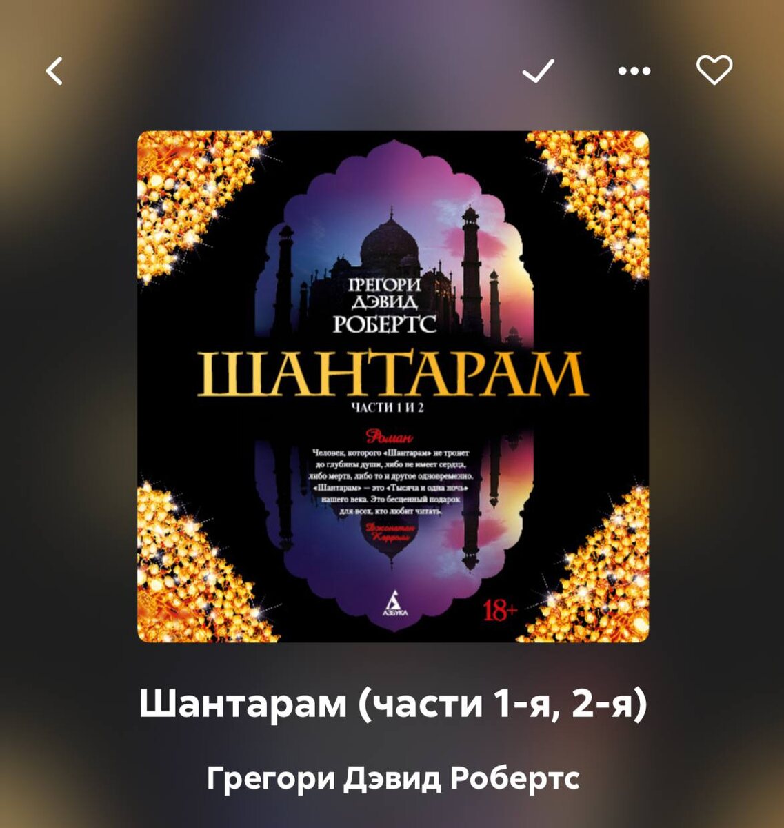 "Шантарам" - Грегори Дэвид Робертс Жанр #книги: #автобиографическаяпроза #современнаязарубежнаялитература #Индия #экранизации ✨Субъективное мнение: 10/10 Великое множество раз мне предлагали прочитать эту книгу, но была в некотором отрицании, представляя себе Восток с его шейхами, богатством и наложницами, который никак не ложились на настроение. Но после очередной восторженной рекомендации от знакомого о невероятных диалогах, поняла, что вряд ли там превалирует любовная линия. И несмотря на недоверие, с самого начала была захвачена магией этих Индийских блужданий 🪬 🕉 Пока нахожусь в процессе прочтения всей серии, состоящей из пяти частей. Поэтому расскажу об эмоциях от первых, чей антураж и событийный ряд дают забыть об отсутствии стройного развития сюжета, ведущего к яркому финалу. При прочтении крайней главы приходит ясность, что окончание уже через несколько страниц, а центрального инцидента, повернувшего ход в ту или иную сторону, так и произошло. Есть только жизнь, где поиск