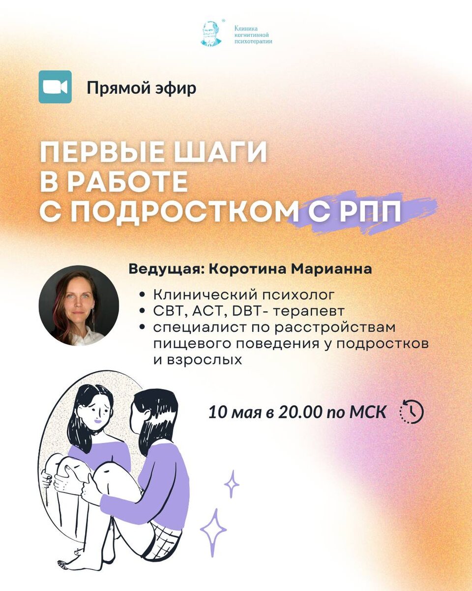🎥 ЗАПИСЬ ПРЯМОГО ЭФИРА «Первые шаги в работе с подростком с РПП» На эфире разобрали: 🟢С чего начать терапию, если к вам пришёл подросток с признаками РПП? 🟣Как проявляются расстройства пищевого поведения у подростков на начальном этапе — и что важно не упустить специалисту 🟡Почему работа с РПП — это не только про еду, а про регуляцию эмоций, самоконтроль и семейную динамику 🔵Как без осуждения и давления наладить контакт с подростком, у которого РПП 🟢Как безопасно выстроить первые шаги терапии, чтобы не усугубить симптомы и многое другое СМОТРЕТЬ Напоминаем, что сегодня до 21:00 еще действует специальное предложение - скидка 10% на курс «ТЕРАПИЯ РПП У ДЕТЕЙ И ПОДРОСТКОВ» (чтобы купить со скидкой пишите нашему менеджеру @cbtclinic_education)