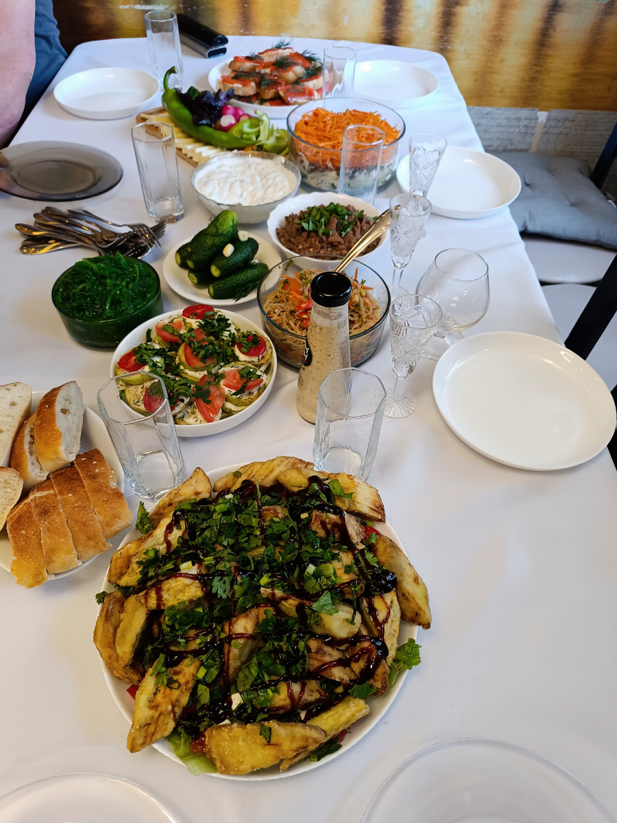 Всем добрый день, дорогие подписчики и гости канала. Опять немного подвела вас, пропала из Дзена. Каждый раз, когда нет времени на статьи, сложно вернуться в привычный ритм написания. Хотя знаю, вот просто садись и пиши, статья сама сложится и слова найдутся. Но мне кажется не интересно вам это наверное. Ну, я начну, а там посмотрим 😉 Про день рождения сестры вам рассказывала А через неделю, 2 мая мы отмечали день рождения моего мужа в скромном семейном кругу. Я была после работы, поэтому стол накрыла как успела. Получился ужин в почти кавказском стиле. Муж накануне сам накрутил долмы Я приготовила салат слоёный, кабачки с соусом, огурцы замолосолила, фунчозу приготовила, соус к долме. Перед приходом гостей приготовила салат с хрустящими баклажанами. А на горячее покупала в армянском магазине у частника готовые хинкали. Очень вкусные. Главный ценитель сказал:"Мммм, вкуснятина! "😋 Очень здорово посидели, дети конечно не давали нам скучать. Они главные двигатели толпы😅Веселили нас и