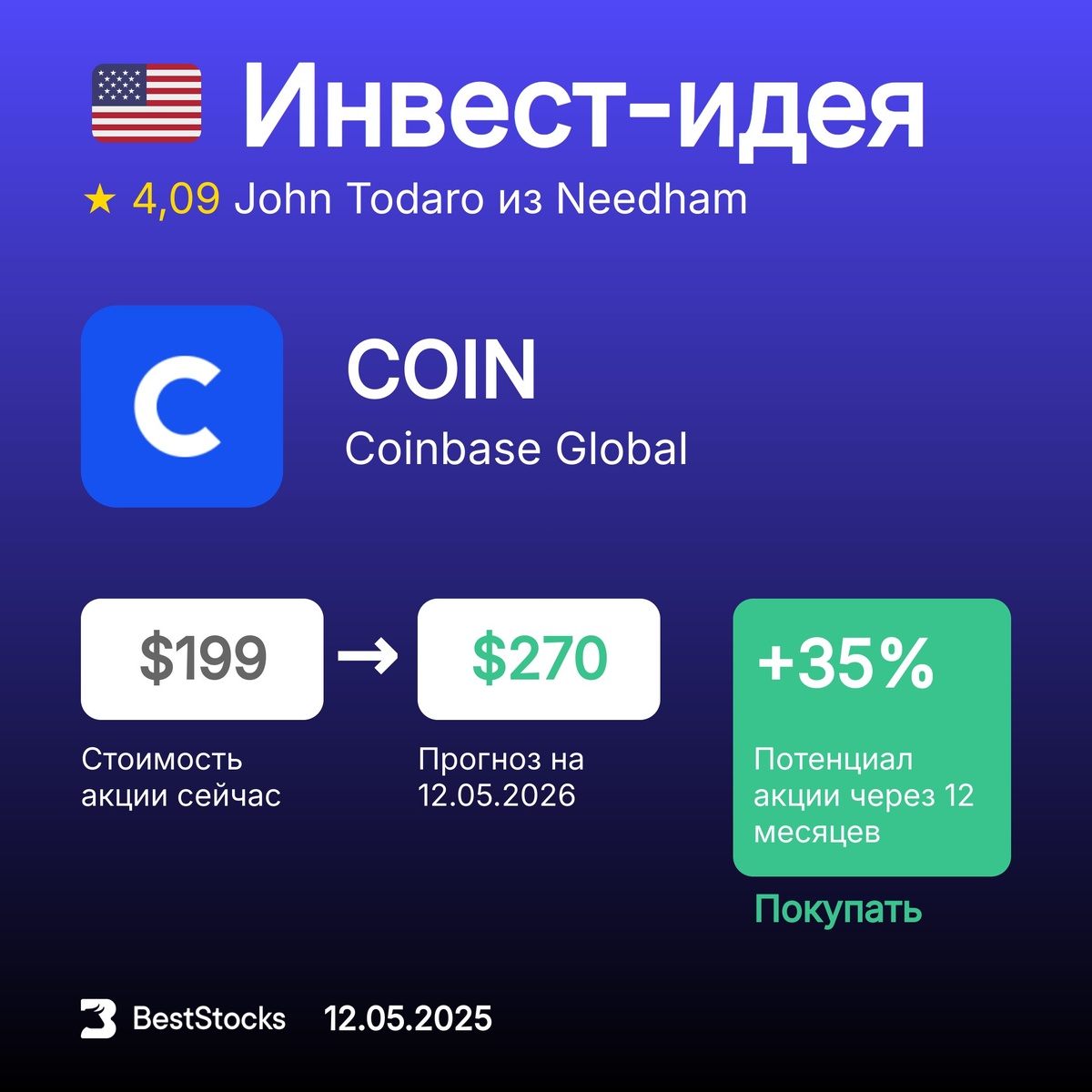🇺🇸 Инвест-идея по акции Coinbase Global Тикер: COIN Прогнозная цена: $270 (+35%) Рекомендация: Покупать InvestRank акции: 7 из 10 Прогноз сделан: 12.05.2025 Прогноз до: 12.05.2026 Инвест-компания: Needham Аналитик: John Todaro Ещё рекомендации на сегодня → ••••• 🏆 Сделали для вас список топ-25 лучших аналитиков в России и во всём мире. По каждому подробная информация: показатели доходности, успешность прогнозов и история рекомендаций по каждой акции. Уникальный инструмент, доступный на русском языке.