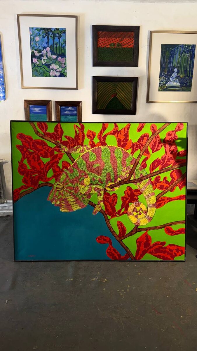 Когда цвет становится эмоцией: визит в мастерскую Марины Икоку @marinaikoku Сегодня провела несколько часов в мастерской питерской художницы Марины Икоку, и до сих пор нахожусь под впечатлением. Это тот редкий случай, когда искусство не просто смотришь — его проживаешь. Икоку — мастер цвета в самом чистом его проявлении. Её работы не просто яркие — они вибрирующие. Жирафы на черном фоне с разноцветными полосами, хамелеон на ярко-зеленом фоне с красными листьями, тропический цветок на глубоком синем — каждая картина как отдельная эмоциональная вселенная. Особенно впечатлила монументальная работа с черепахой — огромное полотно, где золотистые оттенки создают почти тактильное ощущение панциря. Или две яркие лимонно-желтые цитрусовые на контрастном черно-белом фоне с абстрактными завитками — такой простой сюжет, но какая мощная энергетика! Интересно наблюдать, как художница работает сериями: от спокойных морских пейзажей до экспрессивных животных мотивов. В каждой работе чувствуется бе