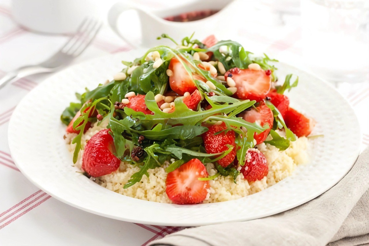 Салат из клубники, кускуса, рукколы и феты