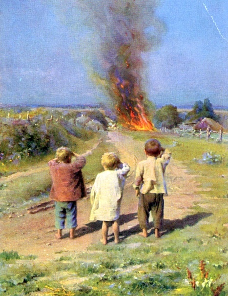 Иван Горохов «Сорванцы. Набедокурили», 1912 год. В детстве я не была замечена за пироманией, хотя пацанам во двор спички выносила. Они делали что-то вроде лизунов. Уже не помню из чего. Но некая подпаленная на небольшом огне субстанция медленно ползала по стене соседского сарая. Мы считали это лизуном и страшно гордились, когда задумка получалась. Почему-то помню, что так было не всегда. Толи не донагревали, толи рецепт нарушали. Как-то нас засекли взрослые, наругали на чем свет стоит, необоснованно обвинили в попытке поджога сарая. Пришлось искать новое убежище. А мы ничего никогда не поджигали. Но наблюдать за уже имеющимся костром любили. Особенно, когда деда давал задание: "Вот линия, за которую огню выходить не положено. Всё, что выпадет, - тушите". Как мы тушили!? Специально давали костру пересечь линию и обдавали песком. Если нужно было погасить пламя быстро, то прямо новыми кроссовками топтали😆 Детское воображение,помноженное на десяток курчавых голов - почти вся улица