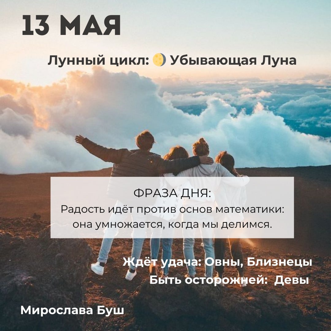 13 мая РЕКОМЕНДАЦИИ: ❤️Сегодня обязательно позвоните или напишите подругам. Уделите им время, если давно не общались. Кстати, говорят после 40 настоящей дружбы не бывает. А вы как считаете? Пишите в комментариях ⤵️ 🪡 Возьмите нитки и иголку. Вышивайте или зашейте что-то старое. Вшивайте в ткань своё намерение. Это древняя практика, которая помогает укрепить внутренние намерения и не дать им «расползтись». ✉️ Подписаться на Мирославу #прогнознадень
