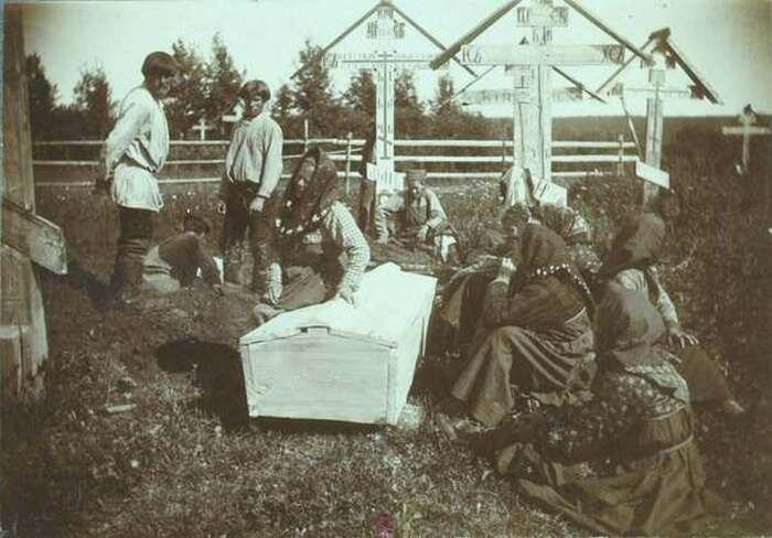Сложились и свои каноны фотографирования: обязательно следовало крупным планом сфотографировать лицо покойного, лежащего в гробу, и обязательно – родственников у гроба Это был самый распространенный тип погребальной фотографии в русской культуре ХХ века. Такие фотографии делались дома, по дороге на кладбище и на самом погосте.