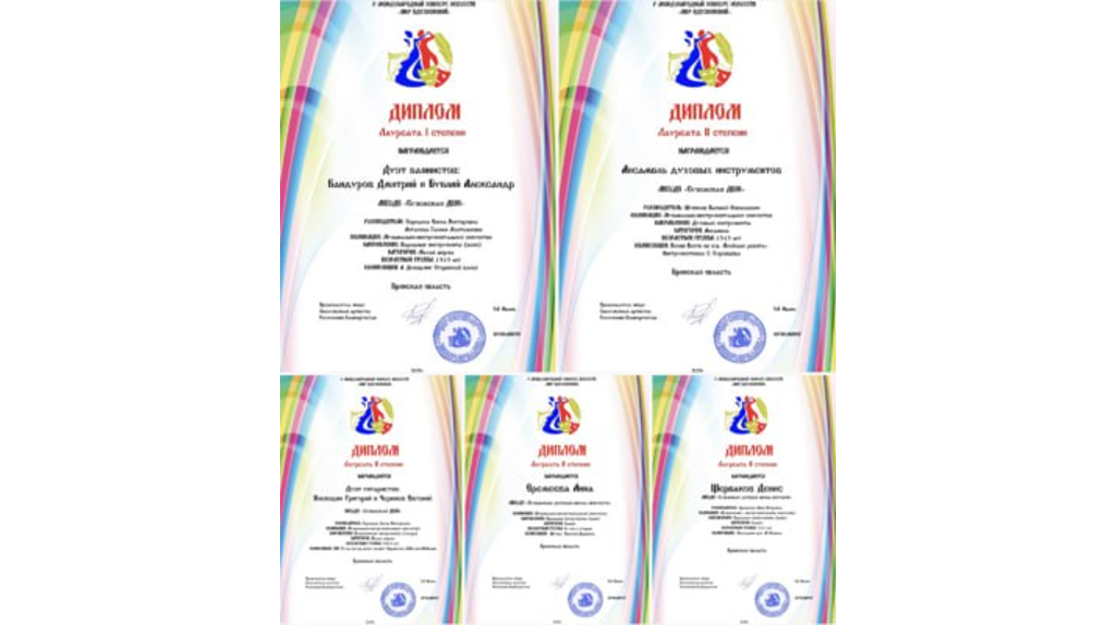 Ученики Суземской детской школы искусств Брянской области стали участниками V Международного конкурса искусств «Мир вдохновений». Их выступления удостоились высокой оценки жюри, сообщает телеграм-канал «Суземка 32». Среди дуэтов баянистов блестяще выступили Дмитрий Бандуров и Александр Бублий (преподаватели Е.В. Середина и Г.А. Астахова). Они стали лауреатами I степени. Диплом лауреатов II степени получил дуэт гитаристов – Григорий Воеводин и Евгений Черняев (готовила Е.В. Середина). Сольное выступление Дениса Щербакова (преподаватель А.П. Еремеева) также удостоено диплома лауреата II степени. Лауреатами второй степени стали ансамбль духовых инструментов под руководством В.Н. Шупикова и Анна Еремеева. Всем педагогам, чьи ученики стали лауреатами, направили благодарственные письма. Суземские музыканты завоевали признание на Международном конкурсе