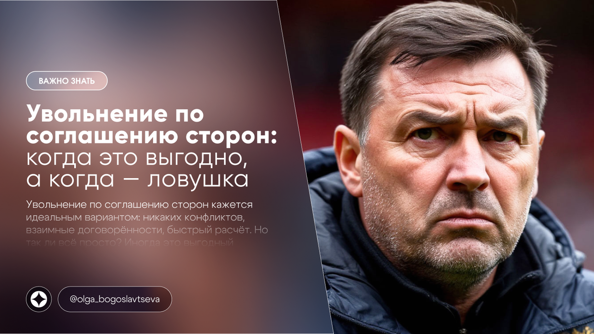 ✅ Минимум конфликтов — стороны сохраняют хорошие отношения. Но есть и подводные камни. Если компания готова выплатить несколько окладов сверх положенного (например, 3–6 месячных зарплат), это может быть отличной сделкой, особенно при риске сокращения. При увольнении по соглашению сторон можно уйти сразу — без обяз