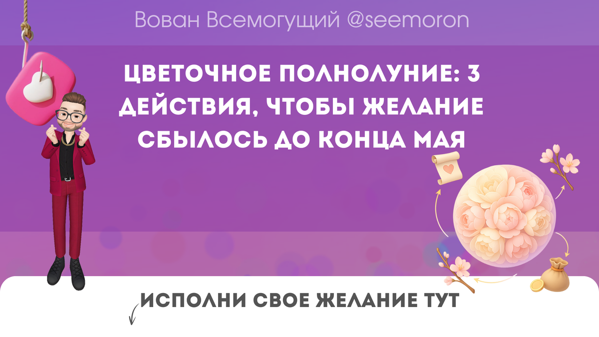 — Вован, я хотела загадать желание… — И? — А загадала «хочу выспаться». — Так это тоже святое! Феюшки, честно: кто сейчас чувствует себя как опавший лепесток? Нет сил, нет вдохновения, желания лежат где-то на дне корзины вместе с невынесенным мусором… А календарь такой: Опа! Полнолуние! Но не просто обычное — Цветочное Полнолуние. А это, между прочим, один из самых энергетически насыщенных моментов в году. И если ты его проспишь (в прямом или магическом смысле) — пропустишь шанс включиться в жизнь на полную мощность. 📌 А если хочешь не пропускать такие шансы — загляни в мой Телеграм. Там уже пышным цветом расцвели практики Это полнолуние, которое выпадает на пик весны — когда природа цветёт, и энергия кипит, как борщ на плите. В 2024 оно наступает 23 мая, и его энергия действует за три дня до и три дня после — значит, время у нас есть, но не тянем, как кота за хвост. Это не про «сверху благословение» — это про «я беру на себя и делаю». Цветочное полнолуние — символ женской силы, расц
