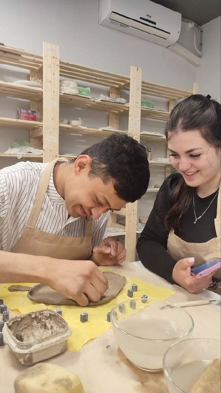❤️ Наш вечерний мастер-класс оказался не просто творческим, а прямо ботанически вдохновлённым 🌿 Весёлая пара — Анастасия и Дониёр — использовали колоски и листочки, чтобы сделать отминку на своих изделиях. Природа рядом — и в каждом отпечатке её нежный шёпот 🌾🌱 Записывайтесь на гончарные свидания у администратора #зарниань #ботаническаякерамика #отминка #вечервмастерской #гончарноелето #природавглине