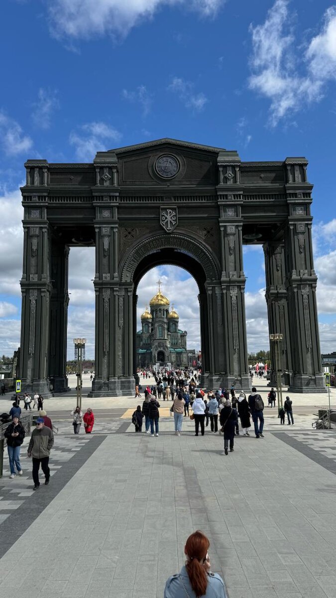 Мы решили поехать в парк Патриот 9го мая, но подумали что там будет много народу и взяли билеты на 10е. ПАРК "ПАТРИОТ" Есть сложности как добраться? Доехать до станции Кубинка или Голицыно - легко, а дальше могут быть проблемы, так как ходит до парка всего один автобус под номером 75. Мы поехали до Кубинки (так как не посмотрели про Голицыно) и встали в очередь на автобус. После 15 минут ожидания, подошли к «бомбиле» в микроавтобусе с табичкой «таксти до парка Патриот», чтобы узнать в какую цену обойдется нам поездка, на что услышав ценник 250 рублей с человека, моментально вызвали 2 такси (так как нас было 6 человек), Что в итоге обошлось нам в 800 рублей. Проезд в автобусе будет стоить 60, но это мы узнали только на обратном пути домой. Есть несколько выходов. Мы входили через «Русский карильон», монументальная арка, которая находится напротив входа в Храмово музейный комплекс - вход свободный. Храм ВС России Открыт был 5 лет назад, в честь 75 летия Победы над фашизмом. Сделан п