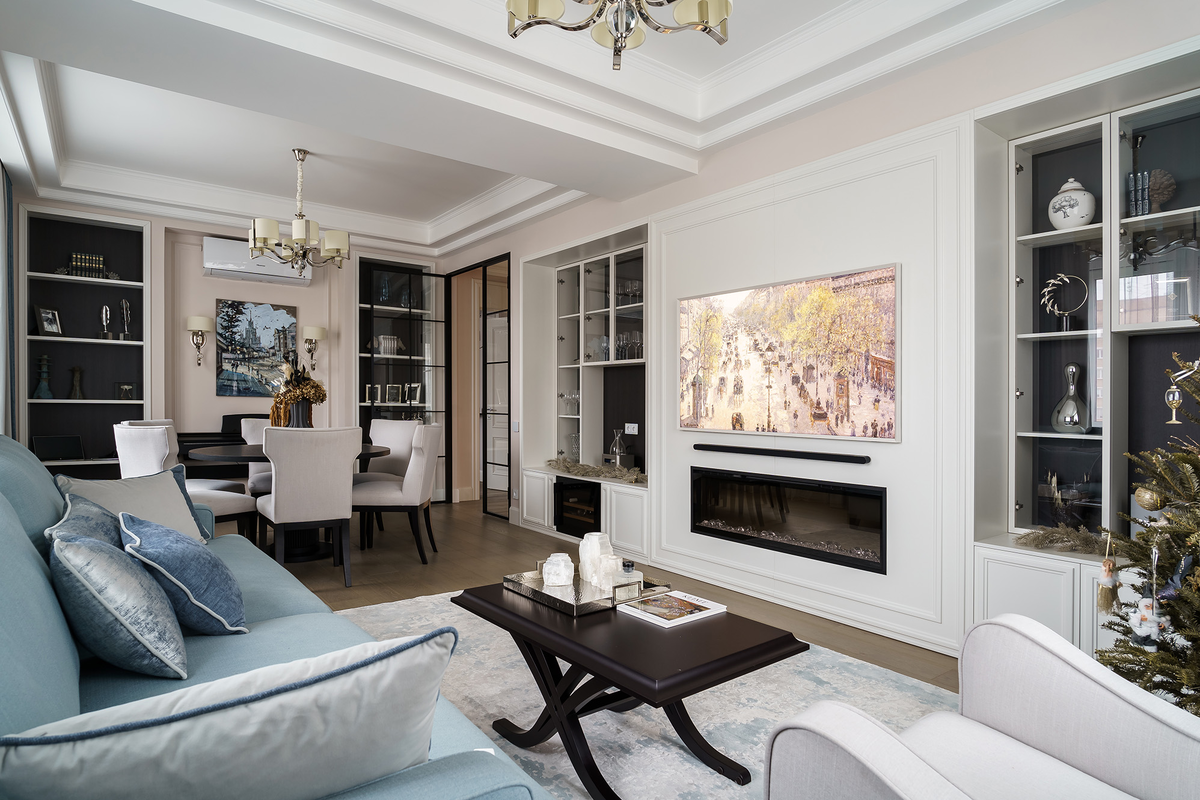 - Антибликовое стекло не только практично, но и подчёркивает чистоту линий.Вечером эта гостиная преображается.