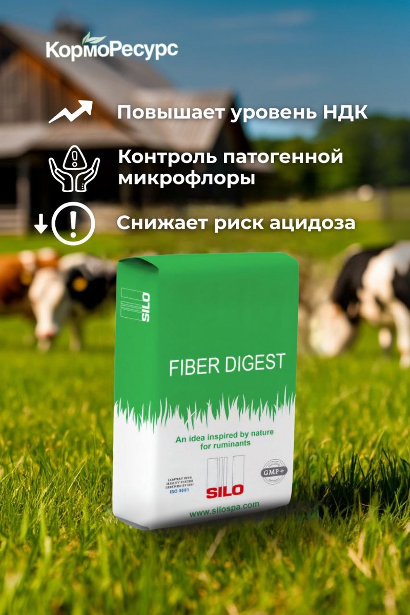 Рацион КРС: внимание к рубцовому пищеварению. Подбирая кормовые добавки для коров, важно учитывать не только энергетические и протеиновые показатели, но и влияние компонентов рациона на микрофлору рубца. Особенно это актуально при высоком содержании крахмала в рационе, низком содержании структурной клетчатки или нестабильной структуре кормосмеси. SILOhealth FIBER DIGEST — инструмент, который помогает обеспечить стабильную работу пищеварительной системы и поддержку здоровья КРС максимально физиологическим способом без агрессивного вмешательства. Зачем это нужно: 〰️ Рубец — сложная ферментативная система, и её баланс легко нарушить. 〰️ Повышенные риски: ацидоз, снижение усвоения клетчатки. 〰️ Развитие в рубце ассоциаций недружественных бактерий, конкурирующих за источники питания, вызывающих различные воспаления или заболевания, такие как клостридиоз или некробактериоз. 〰️ Влияние на привес, надои, общее состояние животных и стоимость содержания. Что делает FIBER DIGEST: ✅ Повышает