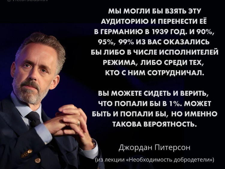 В дни празднования Победы многим кажется: если бы они жили тогда, во времена нацизма, — обязательно боролись бы с режимом. Но многочисленные исследования показывают: большинство людей подчиняются преступной власти, особенно под влиянием пропаганды и давлением авторитета. Почти каждый из нас, скорее всего, оказался бы не в подполье, а на стороне системы. И осознавать это — страшно. Эта дата — повод не для весёлого куража, а для глубокого осмысления — и прошлого, и настоящего. Вспоминаются размышления Джордана Питерсона, исследовавшего природу зла и подчинения. В своей лекции «Необходимость добродетели» он обратился к залу со словами: «Мы могли бы взять эту аудиторию и перенести её в Германию 1939 года. И 90%, 95%, 99% из вас оказались бы либо в числе исполнителей режима, либо среди тех, кто с ним сотрудничал. Вы можете сидеть и верить, что попали бы в 1%. Может быть, и попали бы. Но именно такова вероятность». В. Судаков
