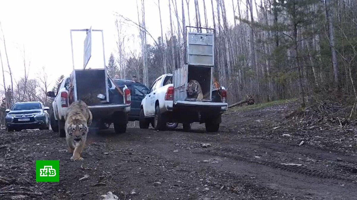 [ Смотреть видео на сайте НТВ ] Двух подросших амурских тигров выпустили в тайгу в Приморском крае. Этой весной хищные кошки нападали на собак в поселках. Полосатые брат и сестра попали в центр «Тигр» еще совсем молодыми тигрятами. Они остались без матери и выживали, охотившись на собак в ближайших поселках. Отпугнуть тигров от человеческого жилья не получилось, больших кошек отловили. Самца поймали в декабре прошлого года, а самку — в этом феврале. Звери были полностью здоровы, хоть и весили чуть меньше нормы. Они вместе учились охотиться и не конфликтовали. Как только тигры подросли, сотрудники парка вывезли их подальше от населенных пунктов и отпустили. [ Смотреть видео на сайте НТВ ]