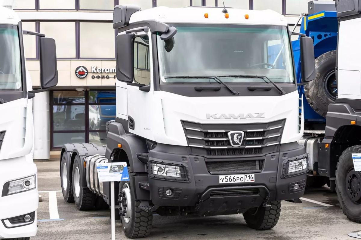 Камский автозавод представил новинку в классе тяжелых грузовиков повышенной проходимости: речь идет о модели 65956, рассчитанной на работу с автопоездом полной массой до 108 тонн. К выпуску приступят в следующем году, сообщили источники Mashnews на заводе. В Казани на завершившейся 11 мая выставке техники, произведенной предприятиями Татарстана, показали новый тягач КАМАЗ-65956. Краткие технические характеристики модели 65956 – колесная формула 6х4, двигатель мощностью 560 л.с. и 16-ступенчатая механическая коробка передач. Проект этот новый и не новый одновременно: испытания первых прототипов начались в 2020 году, тогда тягач был укомплектован 12-ступенчатым роботом производства немецкого концерна ZF, менее мощным двигателем, и полная масса автопоезда равнялась 80 тоннам. По ряду причин работа над новым КАМАЗом была приостановлена и возобновлена несколько лет спустя, теперь – с совершенно другими агрегатами. Модель 65956 не предназначена для передвижения по дорогам общего пользования,