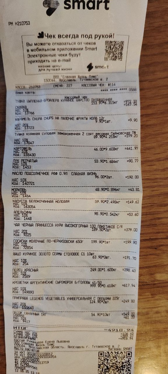Всем привет! Сегодня мы совершили закупку продуктов. В итоге, чек из магазина "Смарт" составил 4918 рублей, а из "Чижика" – 628 рублей. Таким образом, общая сумма покупок достигла 5500 рублей. Изначально я планировала потратить около 5000 рублей, но сегодня мы сделали незапланированную покупку – креветки, которые мы давно не ели 😊😊😊.