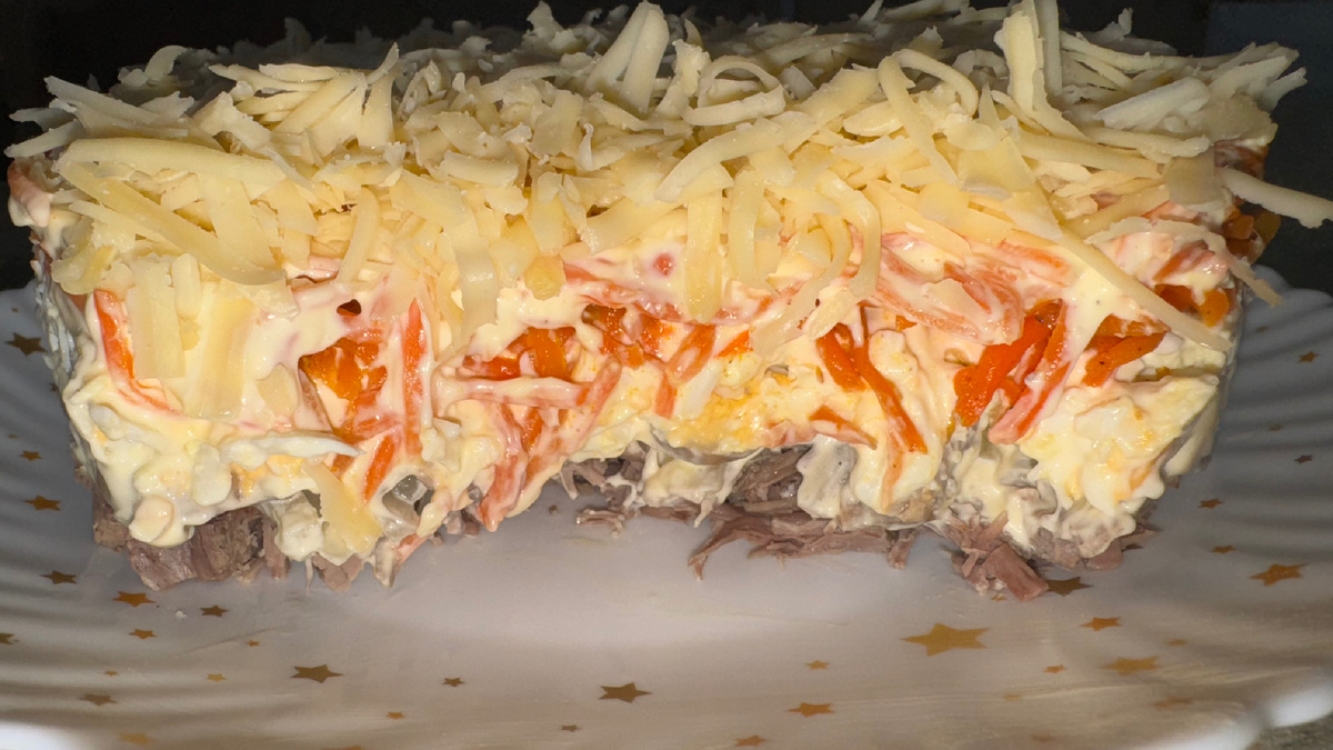 Салат "Мужские слёзы" — это популярное блюдо, которое обычно готовят из простых ингредиентов на праздники и семейные застолья. Название салата связано с шутливой идеей, что он настолько вкусный, что "заставляет мужчин плакать" от удовольствия. Вот один из классических рецептов: Ингредиенты: - Говядина - 500 гр. - Яйца — 4 шт. - Морковь по-корейски — 300 гр. - Лук репчатый — 1 шт. - Майонез - Сыр твёрдый — 150 гр. - Шампиньоны - 400 гр. Подготовка ингредиентов: Приготовление: 1 слой - говядина + майонез 2 слой - маринованный лук 3 слой - шампиньоны + майонез 4 слой - яйца + майонез 5 слой - морковь по-корейски + майонез 6 слой - сыр Салат можно подавать сразу или дать настояться в холодильнике около 30 минут для лучшего вкуса. Приятного аппетита!😋