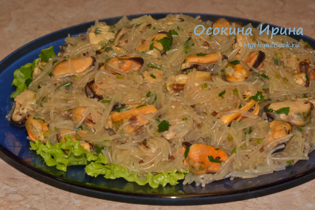 Очень люблю мидии, стараюсь готовить их почаще. Сегодня так: 2 моточка фунчозы сложила в миску, присолила, залила кипятком и оставила на 5 минут, а затем откинула. В сотейнике на оливковом масле быстро обжарила горсть мелко резаных стеблей петрушки, добавила 0,5 кг размороженных мидий, через минуту влила 100 мл сухого белого вина и выпарила в течение 2 - 3 минут, посолила, поперчила, добавила подготовленную фунчозу промешала, добавила 4 ст.л. соуса "Терияки с кунжутом" и промешала, затем добавила большую горсть резаных листьев петрушки, промешала, сняла с огня и сразу подала. Ооочень вкусно получилось)