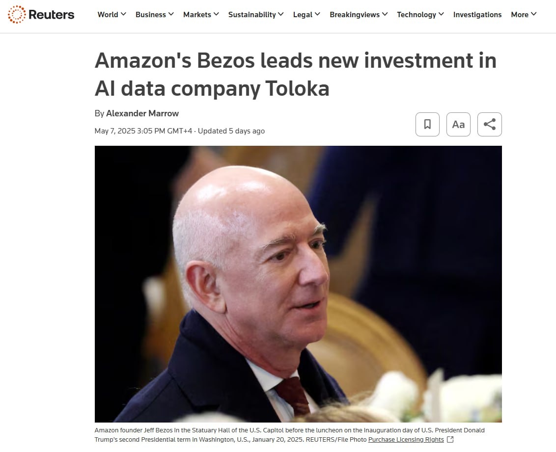 Джефф Безос инвестировал $72 млн в компанию Toloka, ранее связанную с «Яндексом». Toloka помогает в разработке ИИ и занимается задачами по тонкой настройке моделей и обучению с человеческим подкреплением. Сейчас она принадлежит голландской компании Nebius и активно развивается на западных рынках, в том числе, в США. Ещё одним инвестором стал Михаил Парахин, технический директор Shopify. Парахин станет председателем совета директоров Toloka. В будущем компания планирует новый раунд финансирования.