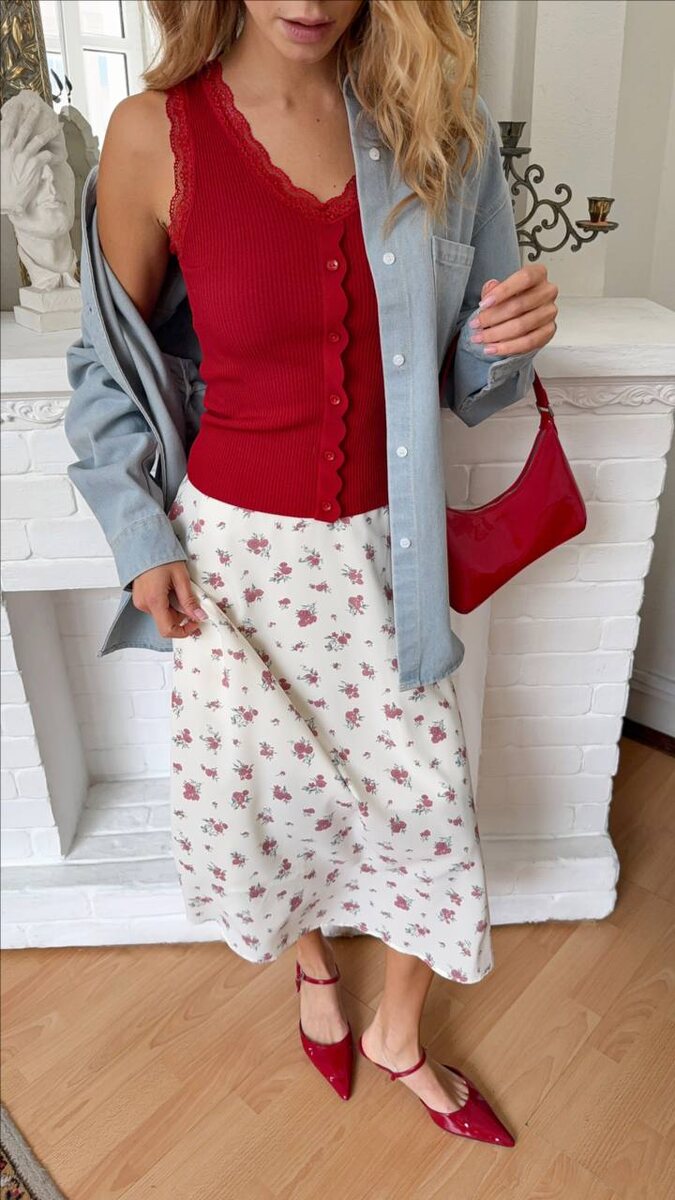 На вечер мы вам приготовили сочный образ с алым топом и цветочной юбкой. Добавили джинсовую рубашку для баланса и аксессуары в тон топу. Получилось очень по-летнему прекрасно! Что скажете?
