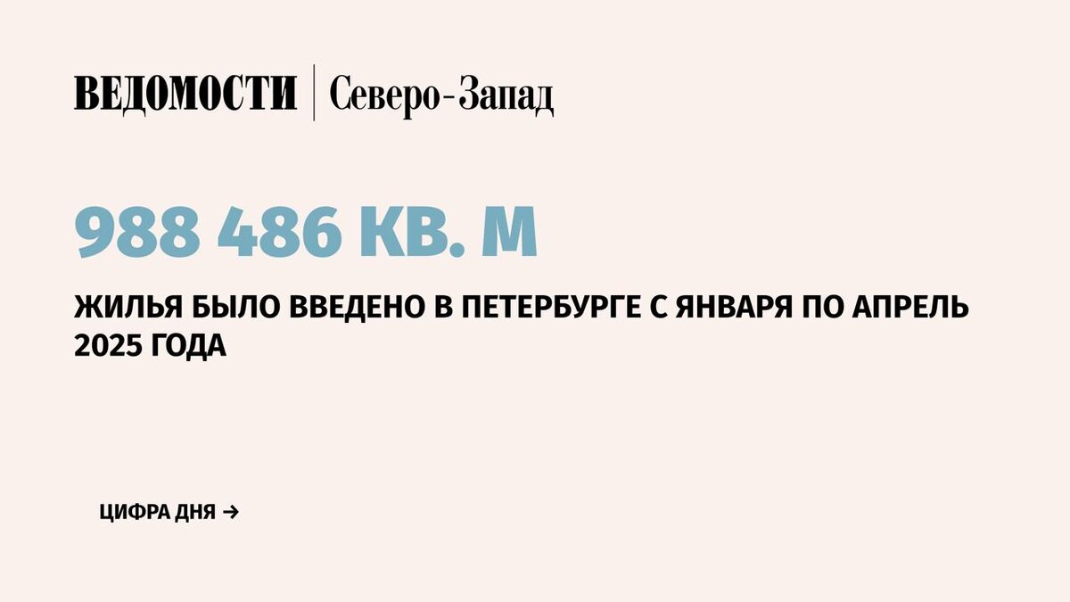 Ввод нового жилья в Петербурге в январе-апреле 2025 г. составил 988 846,6 кв. м, что на 15,7% меньше по сравнению с аналогичным периодом 2024 г. (1,17 млн кв. м), следует из данных комитета по строительству города и Петростата. Таким образом, в городе замедлились темпы падения ввода нового жилья. Напомним, в I квартале 2025 г. отставание от аналогичного периода 2024 г. составляло 34%. ➡️ В апреле в Северной столице ввели 285 275,6 кв. м жилья. Относительно аналогичного периода прошлого года, когда в Санкт-Петербурге ввели 104 102 кв. м жилья, в апреле текущего года ввод жилья увеличился в 2,7 раза. По сравнению с мартом 2025 г. (115 663,8 кв. м) этот показатель увеличился почти в 2,5 раза. 📰 Подпишитесь на «Ведомости Северо-Запад»