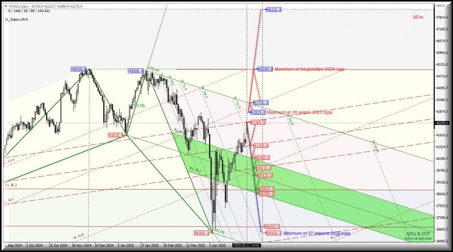https://basechop.ru/wordpress/?p=42315 Операционный масштаб Minor (таймфрейм Daily) Основные технические уровни для торговли #INDU – Daily – обзор вариантов движения c 13 мая 2025 года. Предыдущий обзор #INDU (таймфрейм h4) от 05.05.2025 г. 17:29 ____________________ #INDU – Dow Jones Industrial Average Промышленный индекс Доу Джонса – старейший из существующих американских рыночных индексов. Он был создан для отслеживания развития промышленной составляющей американских фондовых рынков. Индекс охватывает 30 крупнейших компаний США. ____________________ Развитие движения #INDU-Daily с 13 мая 2025 года продолжится исходя из отработки и направления пробоя диапазона: – уровень сопротивления 42829.0 maximum от 26 марта 2025 года; – уровень поддержки 42300.0 на верхней границе канала 1/2 Median Line вил старшего операционного масштаба Minor-Daily. Восходящее движение: Последовательный пробой уровня сопротивления 42829.0 – maximum от 26 марта 2025 года – и конечной линии FSL (43