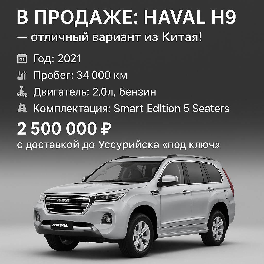Haval H9 — это флагманский внедорожник китайского автопрома, созданный для тех, кто не боится бездорожья и при этом ценит комфорт бизнес-класса. Полноразмерный кузов, надёжная рамная конструкция, полный привод и богатая комплектация делают H9 настоящей находкой для путешественников и семейных автолюбителей. Компания WEICARSAUTO предлагает приобрести полностью проверенный Haval H9 в комплектации Smart Edition (5 мест) с небольшим пробегом и доставкой «под ключ» до Уссурийска, а также возможностью отправки в любой регион России. 📅 Год выпуска: 2021