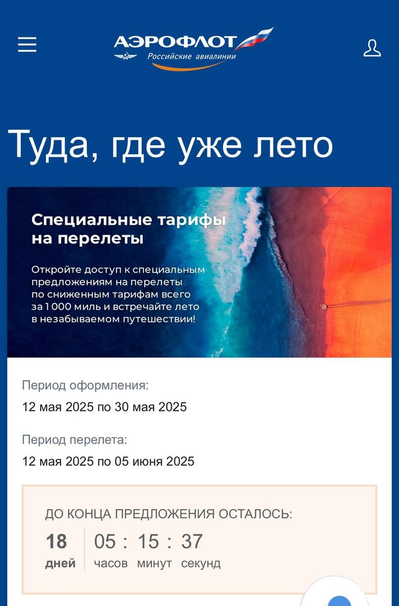 ✈️У аэрофлота снова акция за 1000 миль + сборы Период оформления: 12 мая 2025 по 30 мая 2025 Период перелета: 12 мая 2025 по 05 июня 2025 https://www.aeroflot.ru/ru-ru/promo_sa_may25?utm_source=cm&utm_medium=email&utm_campaign=smartaward_may25&utm_content=all_dest_button