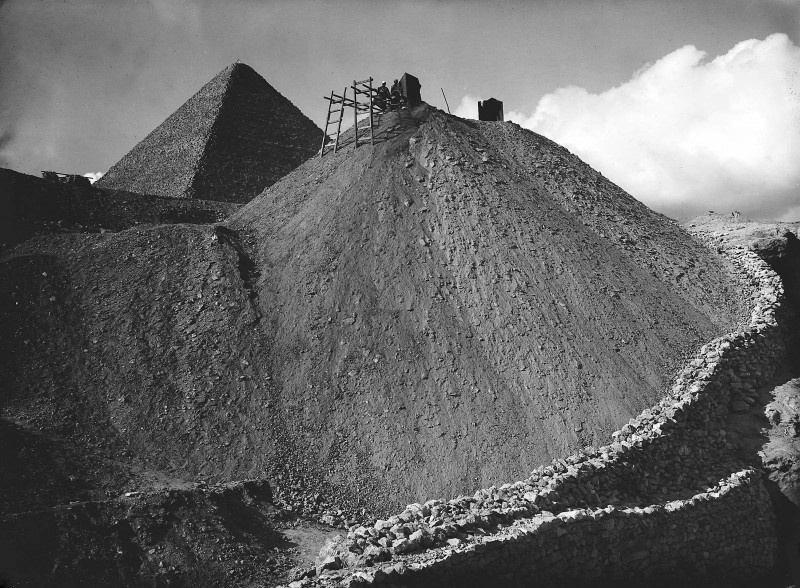 Есть среди его фотографий, приведенных в статье, и эта. А вот текст под ней гласит следующее: «В январе 1930 года Ибрагим сфотографировал раскопанный курган в Гизе с великой пирамидой Хуфу, выглядывающей сзади, возвышающейся в кадре лишь немного выше, сопоставляя прошлое и настоящее...» https://www.aramcoworld.com/Articles/September-2021/Egyptology-s-Eloquent-Eye