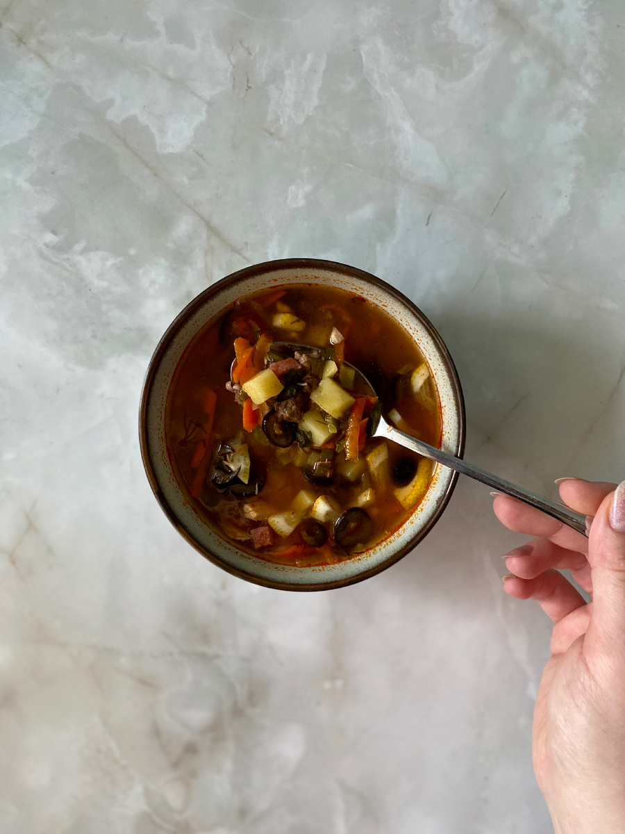 Ингредиенты: Мясо (свинина/говядина) — 350 гр Копченая колбаса — 150 гр Соленые огурцы — 100 гр Лук репчатый — 1 шт Морковь — 1 шт Картофель — 2 средних Томатная паста — 2 ст. л Растительное масло — 1 ст. л Лавровый лист — 2 шт Перец душистый — 4 шт Соль, перец — по вкусу Вода 2–2,5 л Зелень Для подачи: Лимон — несколько долек Сметана — по вкусу Маслины/оливки — по желанию Приготовление: Подаем горячей, добавив в каждую тарелку дольку лимона, несколько маслин и ложку сметаны.