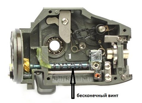 Основной элемент такой катушки — винтовая передача (червячный вал), которая взаимодействует с ведущей шестерней. Этот механизм обеспечивает возвратно-поступательное движение шпули с переменной амплитудой.