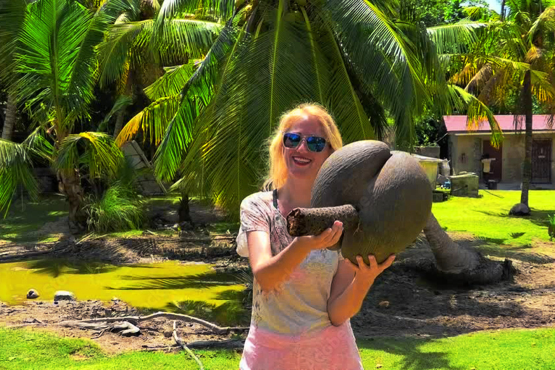 Привет, мои дорогие любители необычной земной природе. Сегодня у нас ботанический выпуск из рубрики "самое-самое", в котором я расскажу о растении с самым большим семенем. На фото выше туристка рассказывает своему кавалеру о планах на вечер позирует с частями сейшельской пальмы (Lodoicea maldivica), если быть точным, то с частью мужского цветка и плодом. Отличить мужское растение данного вида довольно просто – по цветку (на фото ниже). Примечательно, что цветы, расположенные на длинном прицветнике распускаются не одновременно, и цветение занимает несколько лет. Туристам любят показывать очищенное от внешней оболочки семя, которое олицетворяет женскую особь пальмы. Что и говорить, ассоциации, бесспорно возникают. В интернете тоже часто педалируют эти различия между мужским и женским растением, однако сравнение не совсем корректно, так как сравнивают цветок и семя. Но раз есть мужские цветы, есть и женские. Увидеть их довольно непросто, распускаются они ненадолго, и при определённой доли