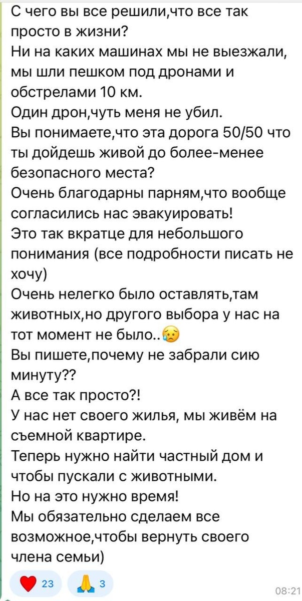 В ответ на пост 🪂 Продолжение истории пса Рона из Новогродовки В этой истории с найденным псом по кличке Рон, оказалось, что хозяйка откликнулась и хочет забрать своего пёселя, но не сразу и на то есть причины! Многие подписчики стали обвинять хозяйку собаки, что она дескать бросила члена семьи, но никто не знает, как всё было на самом деле. А было трудно и сложно с эвакуацией. Никаких машин не было вообще! Какой-то путь, пришлось идти пешком под обстрелами. Девушка немного проясняет ситуацию в своём комментарии... Дорогие, не судите строго, а если можете, то лучше помогите ! Дневник Десантника 🇷🇺 Подписаться