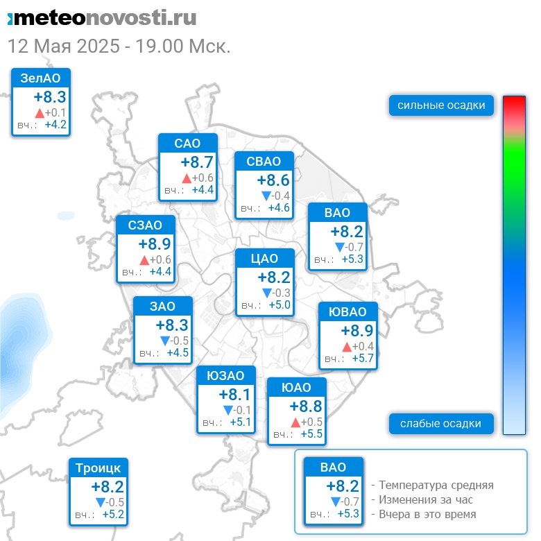 В 19:00 в Москве было от +7.2°C до +9.5°C, средняя температура +8.5°C #погода #Москва #весна #температура #12мая #понедельник