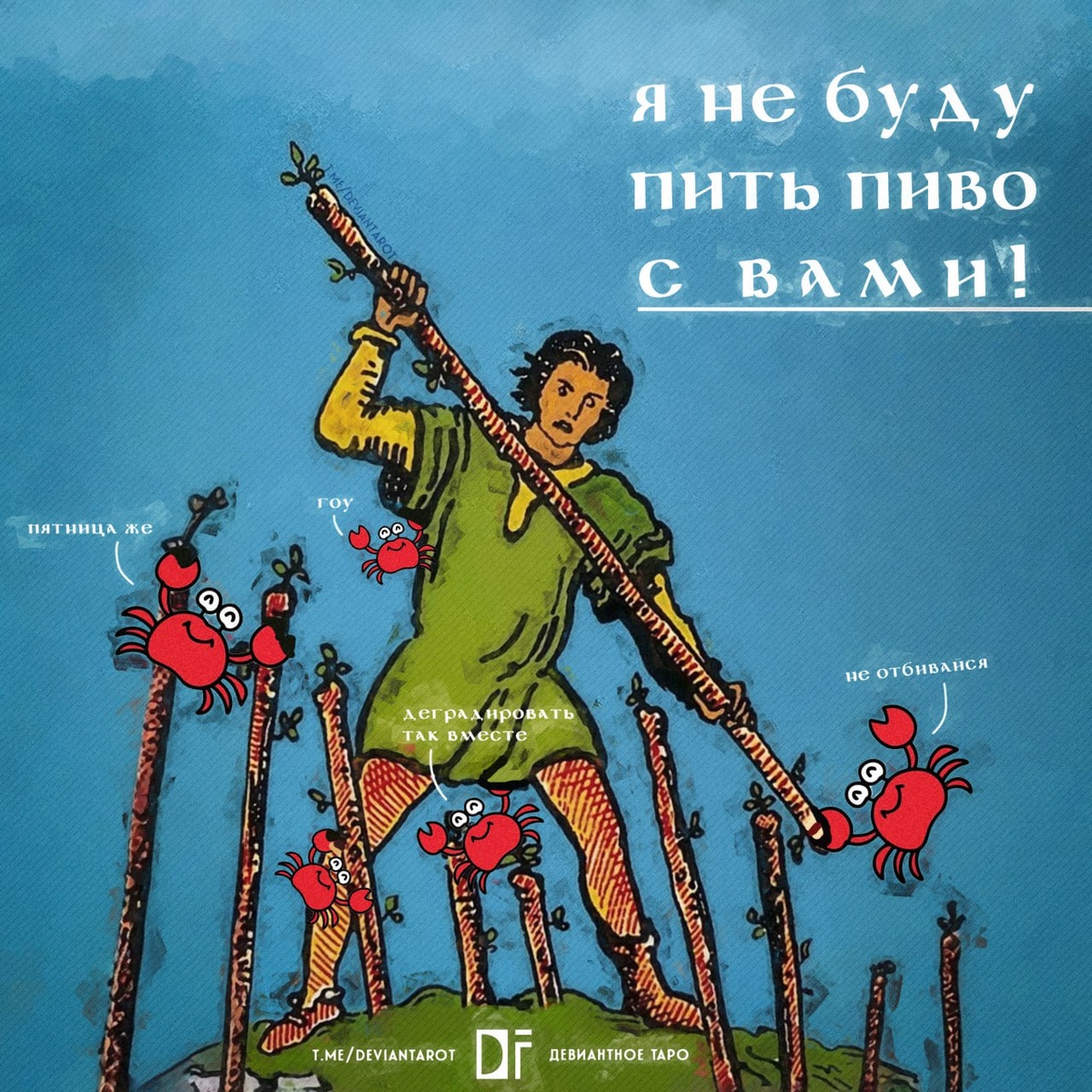 Давайте снова о психологии в тарошках. 🌈7 Жезлов как карта внутреннего кризиса в сфере амбиций все чаще несёт в себе психологические оттенки: после триумфа в 6ке хочется то ли прыгнуть выше головы, то ли отбиться от желающих "сбить тебя с Олимпа" (особенно в классическом Уэйте). Так вот "покушение на Олимп" это так называемый "crab basket". Суть феномена: ты рвёшься вперёд, но окружение (коллеги, «друзья», родня) бессознательно саботирует твой успех. 😱 Почему так происходит? Страх, что ты их «перерастешь», зависть или банальное «я страдал — и ты пострадай». В ход идут: "У тебя не выйдет", "Оставайся с нами", "Ты слишком многого хочешь". Внутренний кризис 7 Жезлов: "ведро" или свобода. Ведь победа уже достигнута, осталось не поддаться родному болоту (а это сложнее, чем кажется на первый взгляд). 😏 #девиантека
